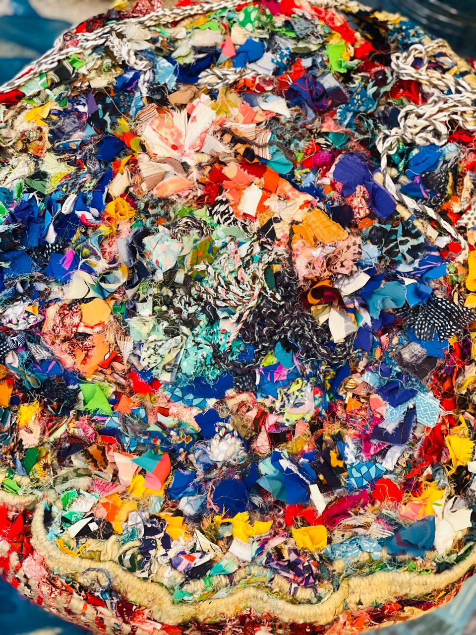 We donate the remaining fabric scraps to a women’s association. They transform the scraps into “bouchawette” rugs and keep all the proceeds from the sales.