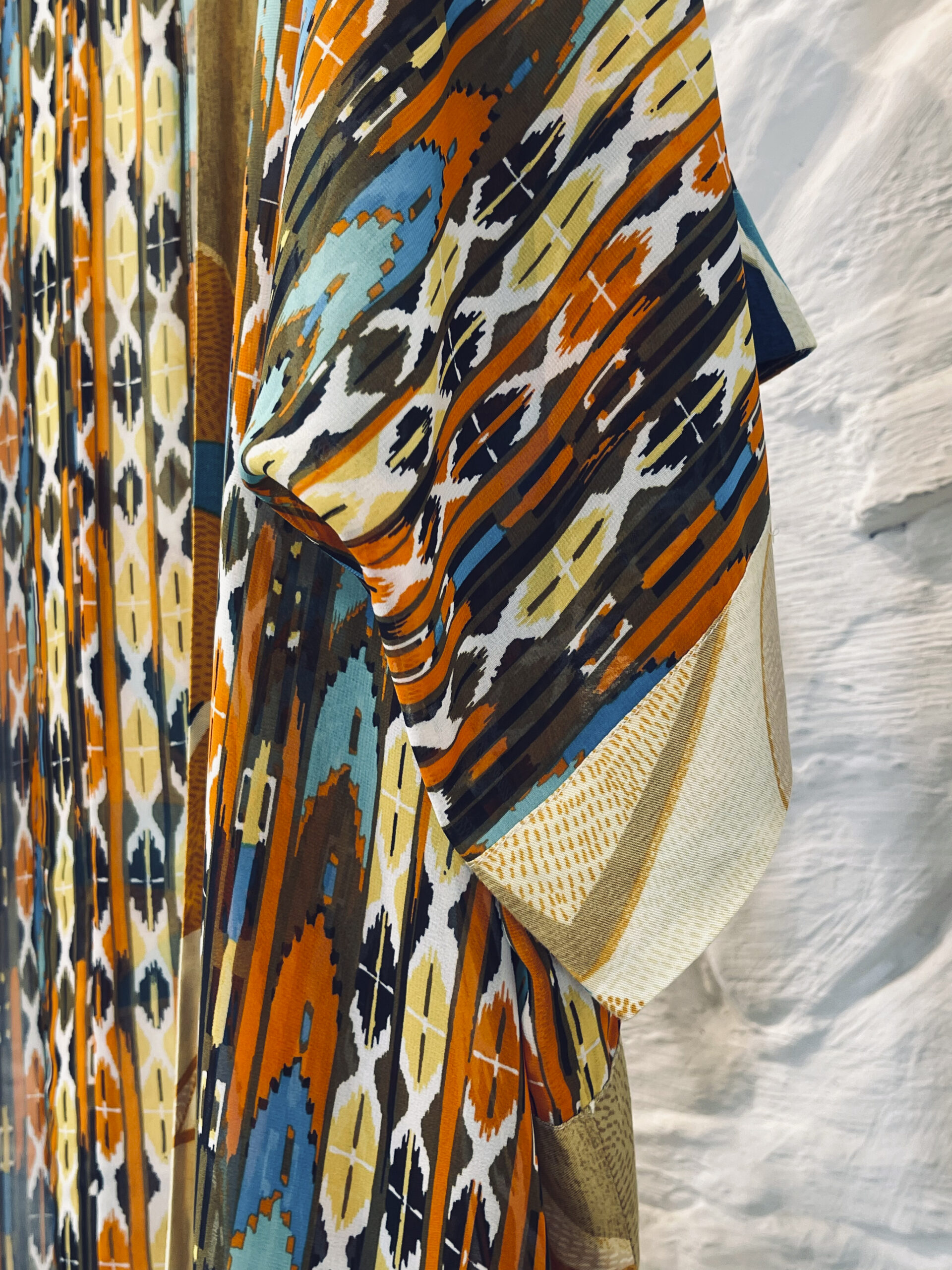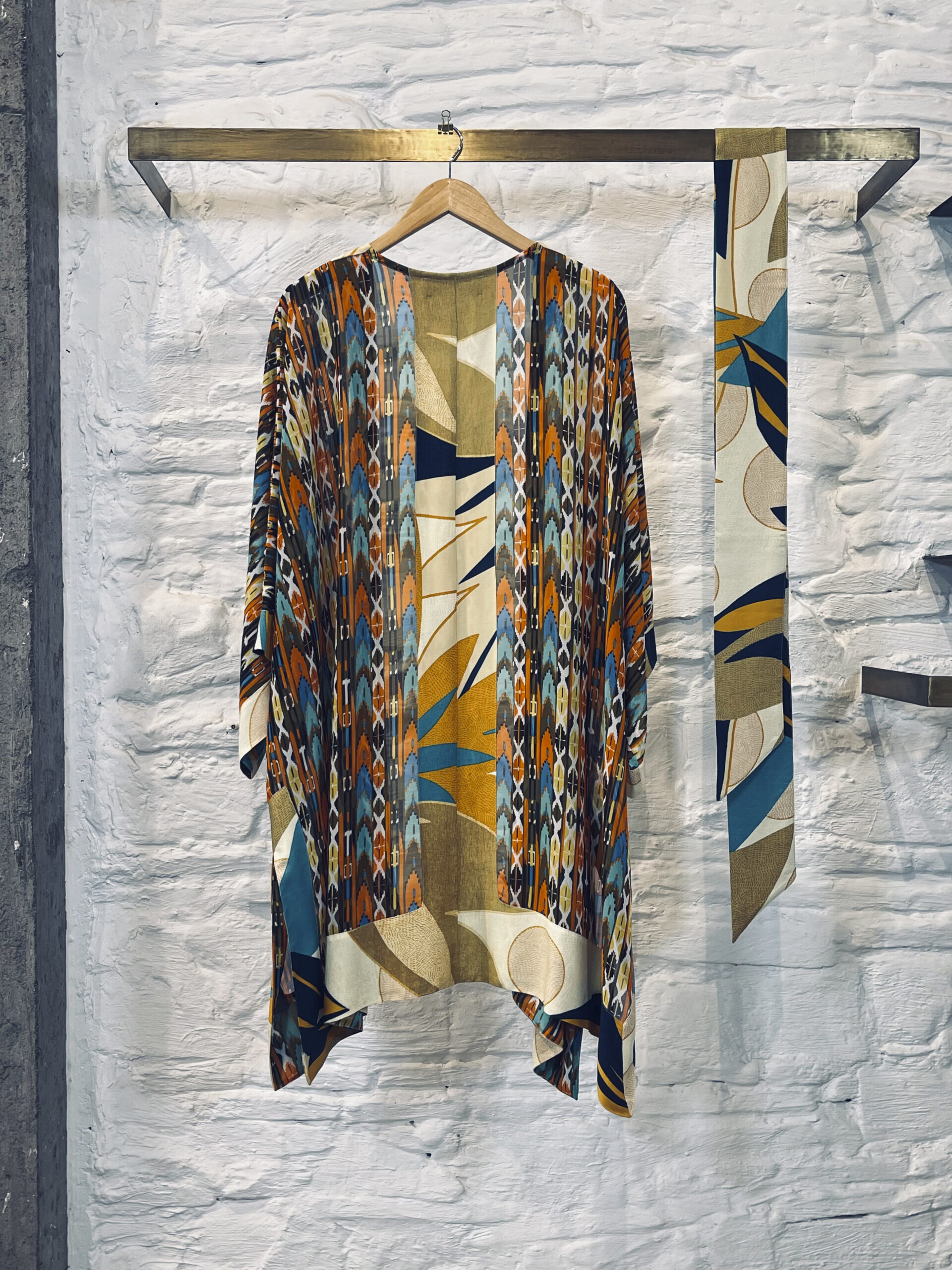 The short Kimono is like a light, fluid jacket. It provides an airy and simple style. It is versatile. You can wear it belted or open. It works for many occasions. During the day, wear it over a dress or shorts. In the evening, wear it over pants with heels. It is elegant and comfortable. It represents an effortless, chic, and practical style.