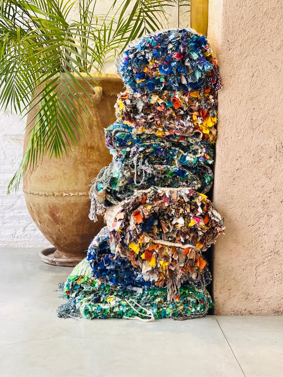 We donate the remaining fabric scraps to a women’s association. They transform the scraps into “bouchawette” rugs and keep all the proceeds from the sales.