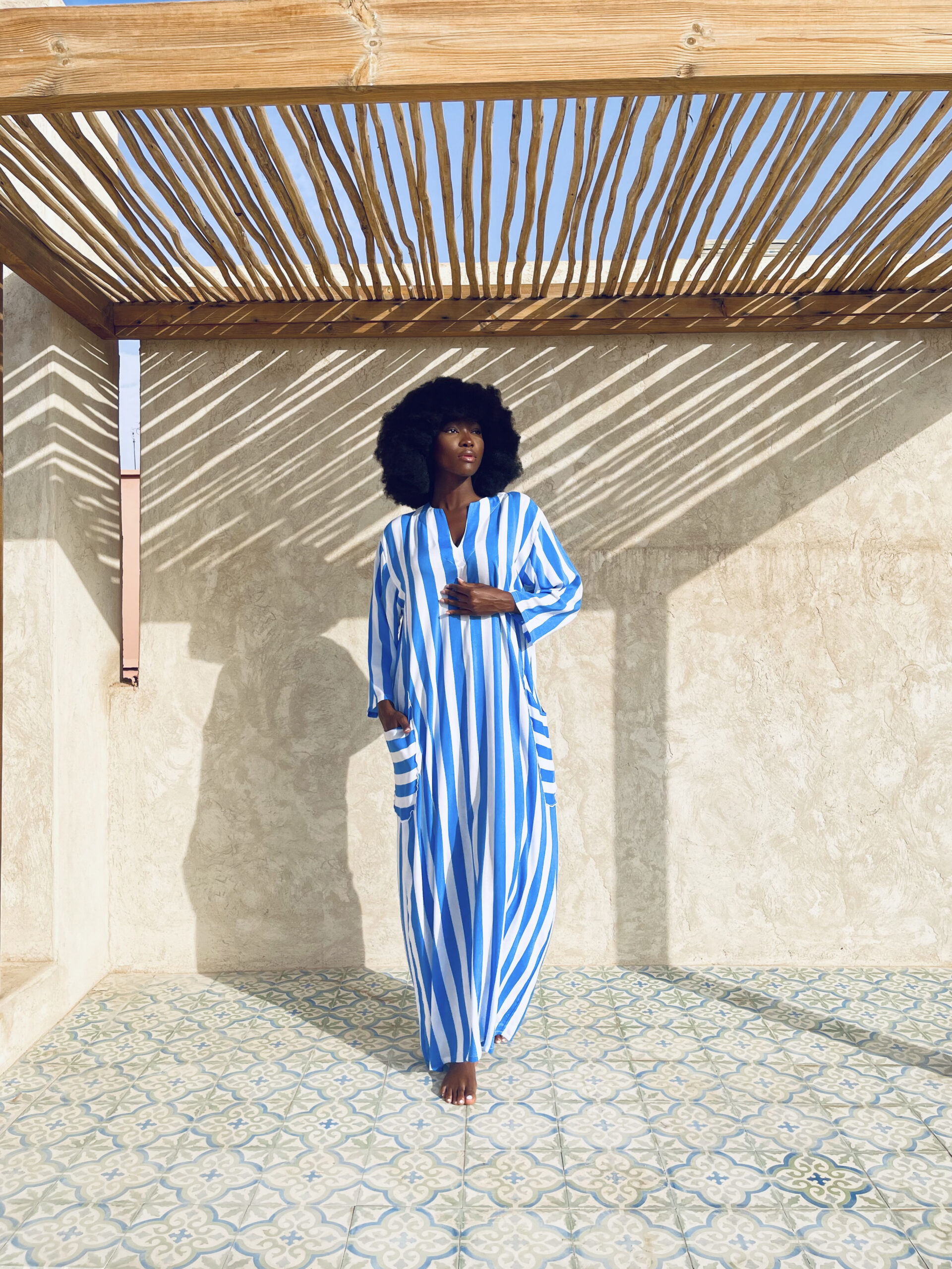 The Azza dress is long and comfortable. It is loved for its freedom of movement, practicality, and natural elegance. It is a bestseller. It is a key piece, easy to wear in all situations.