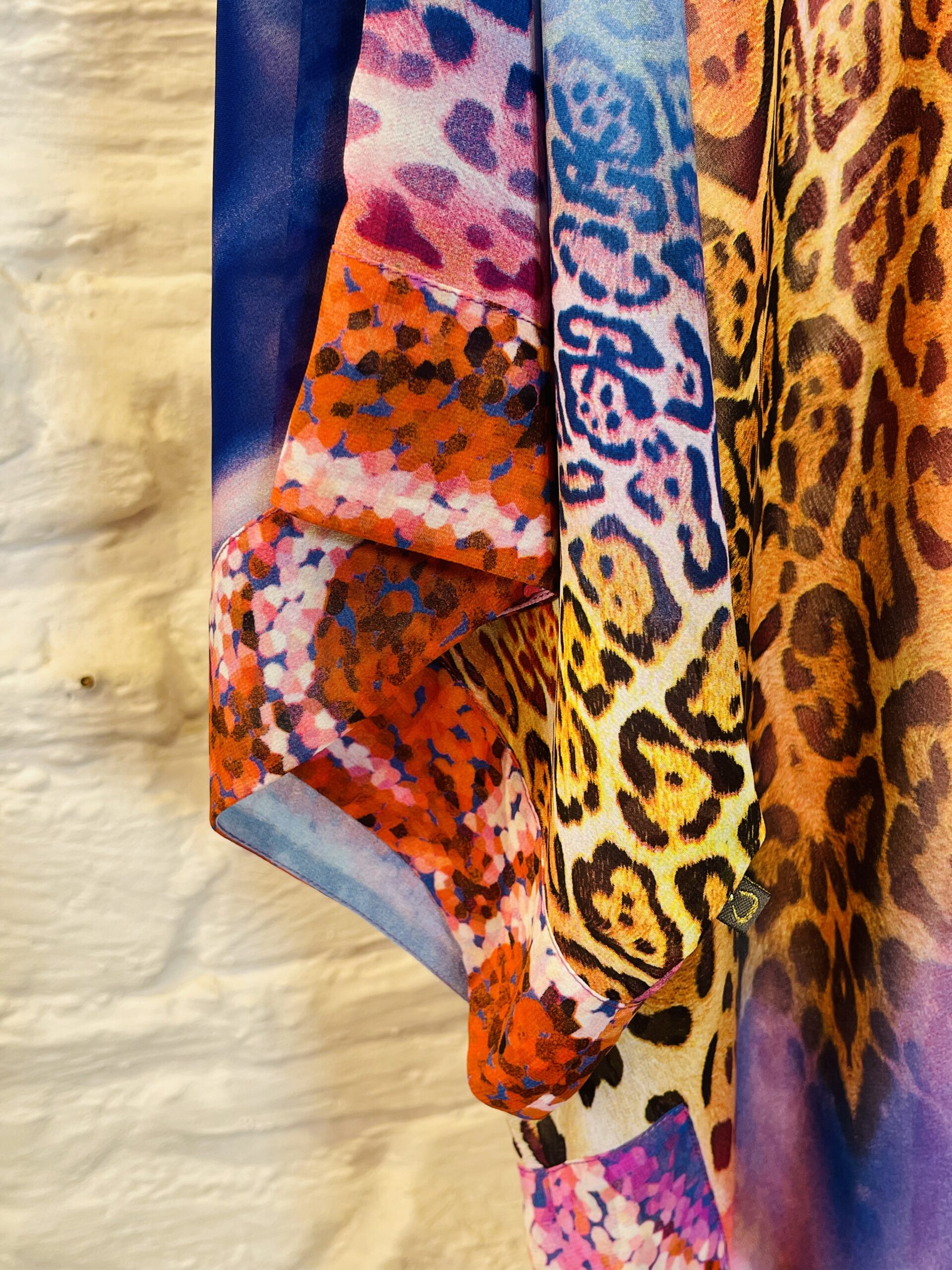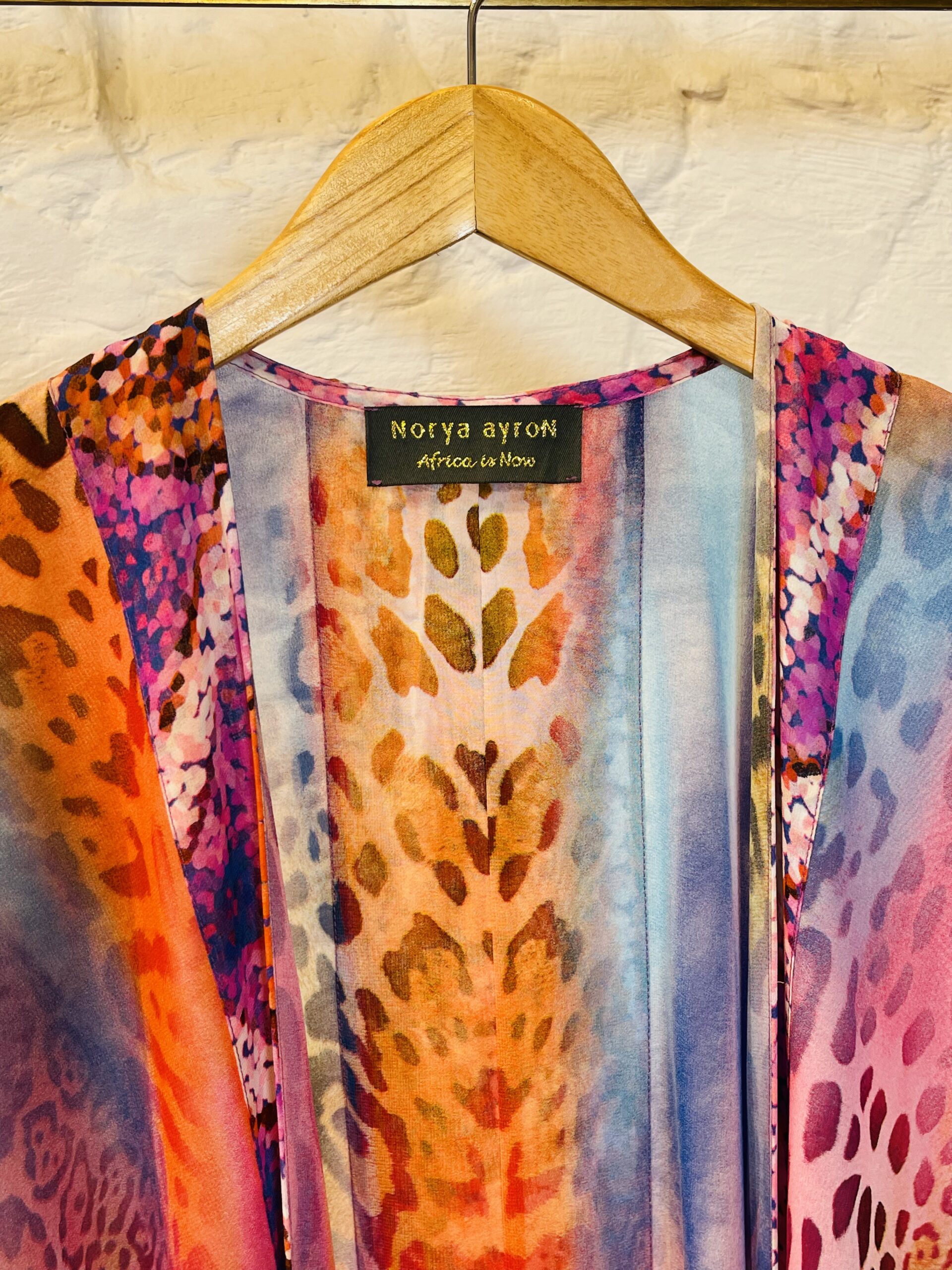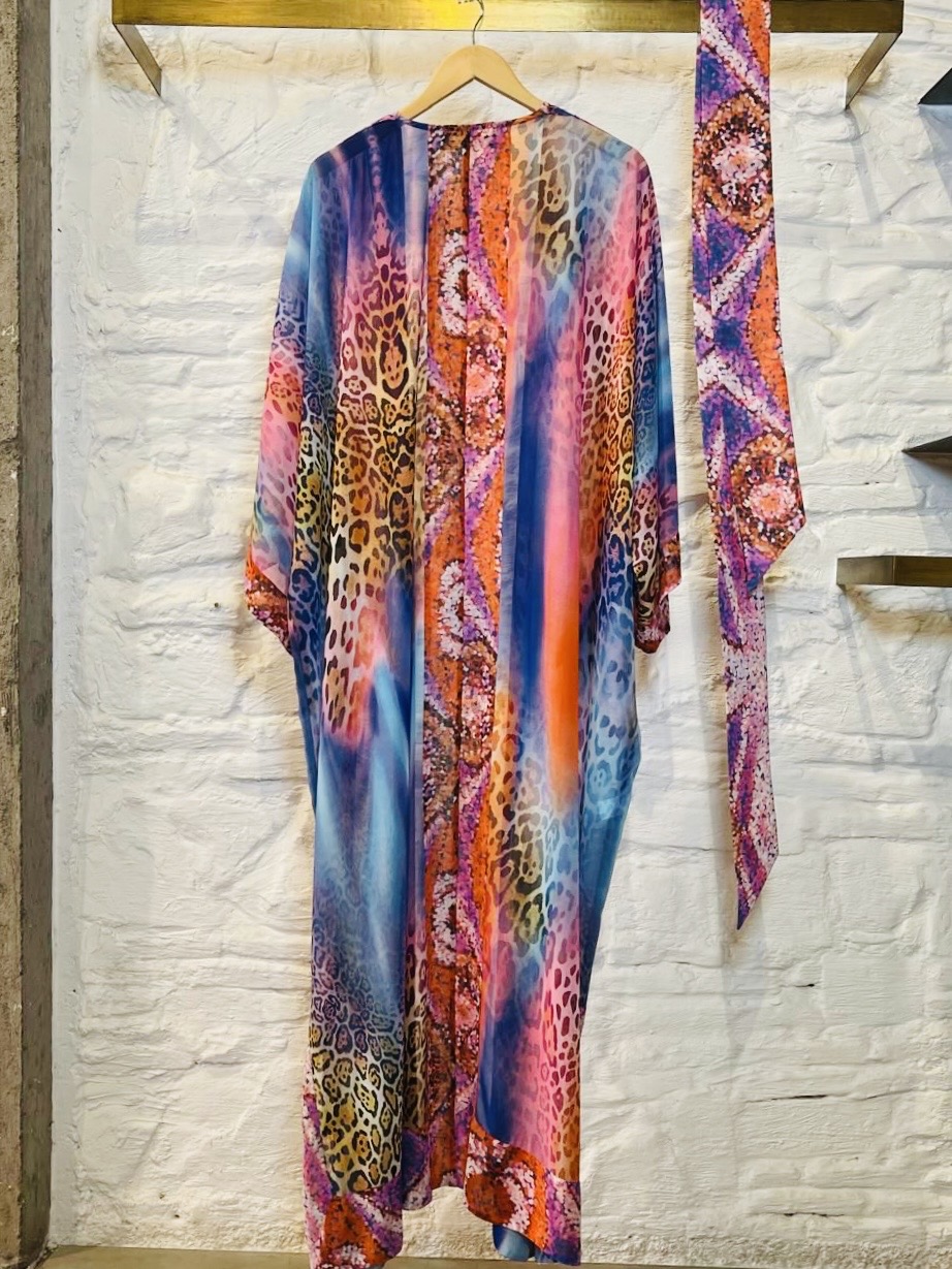 The long Kimono is like a light, fluid coat. It creates an airy silhouette with simplicity. It is versatile. You can wear it belted or open. It works for many occasions. During the day, wear it over a dress or shorts. In the evening, wear it over pants with heels. It is elegant and comfortable. It represents effortless style, both chic and practical.