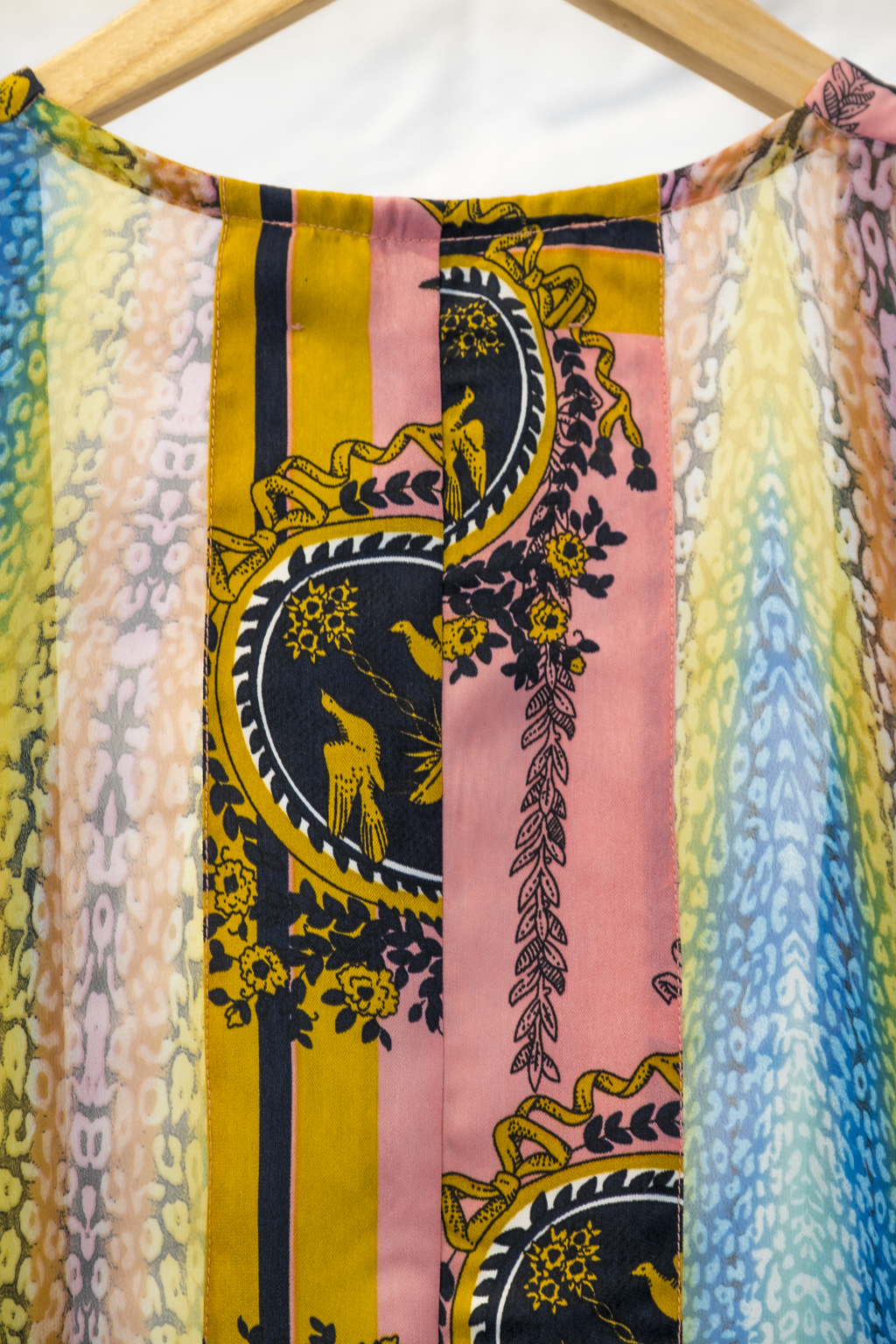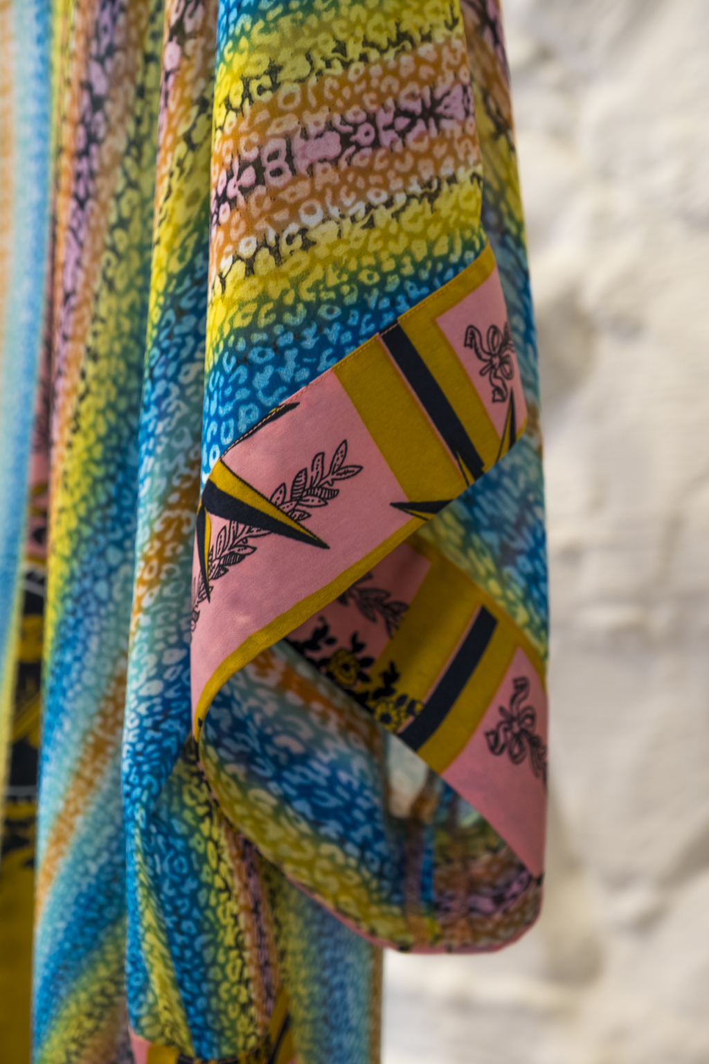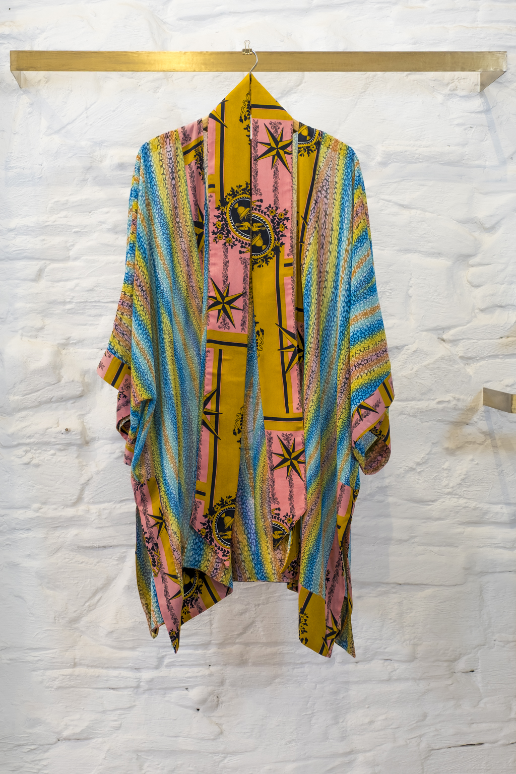 The short Kimono is like a light, fluid jacket. It provides an airy and simple style. It is versatile. You can wear it belted or open. It works for many occasions. During the day, wear it over a dress or shorts. In the evening, wear it over pants with heels. It is elegant and comfortable. It represents an effortless, chic, and practical style.