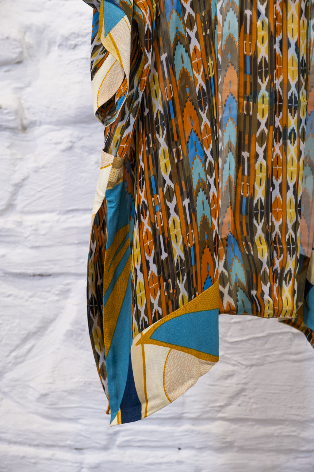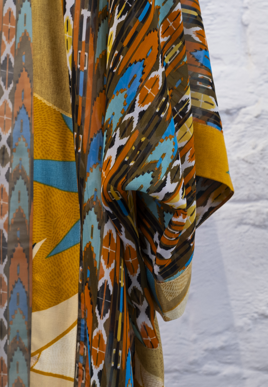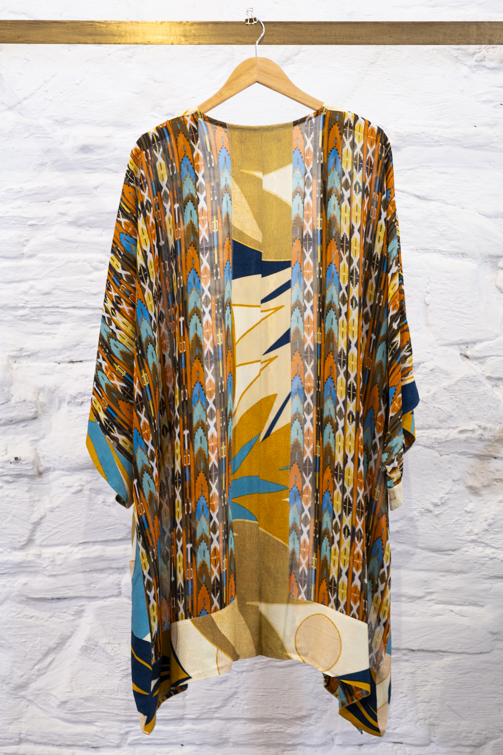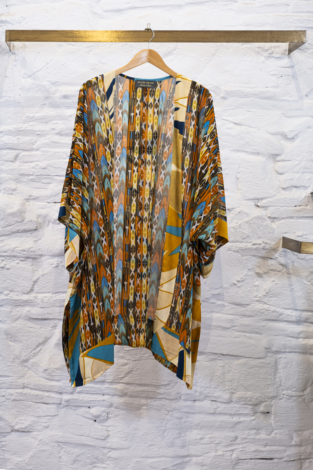 The short Kimono is like a light, fluid jacket. It provides an airy and simple style. It is versatile. You can wear it belted or open. It works for many occasions. During the day, wear it over a dress or shorts. In the evening, wear it over pants with heels. It is elegant and comfortable. It represents an effortless, chic, and practical style.