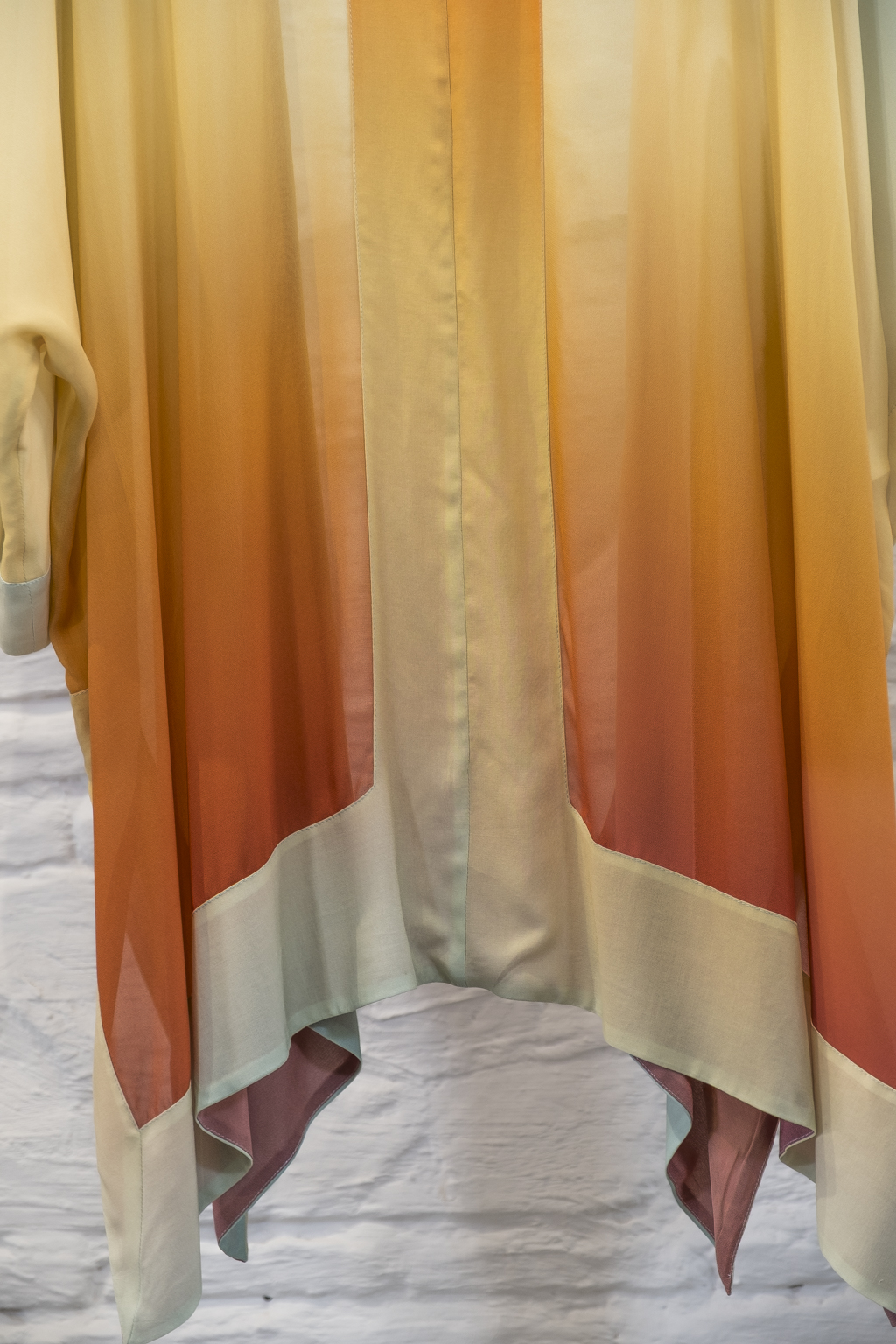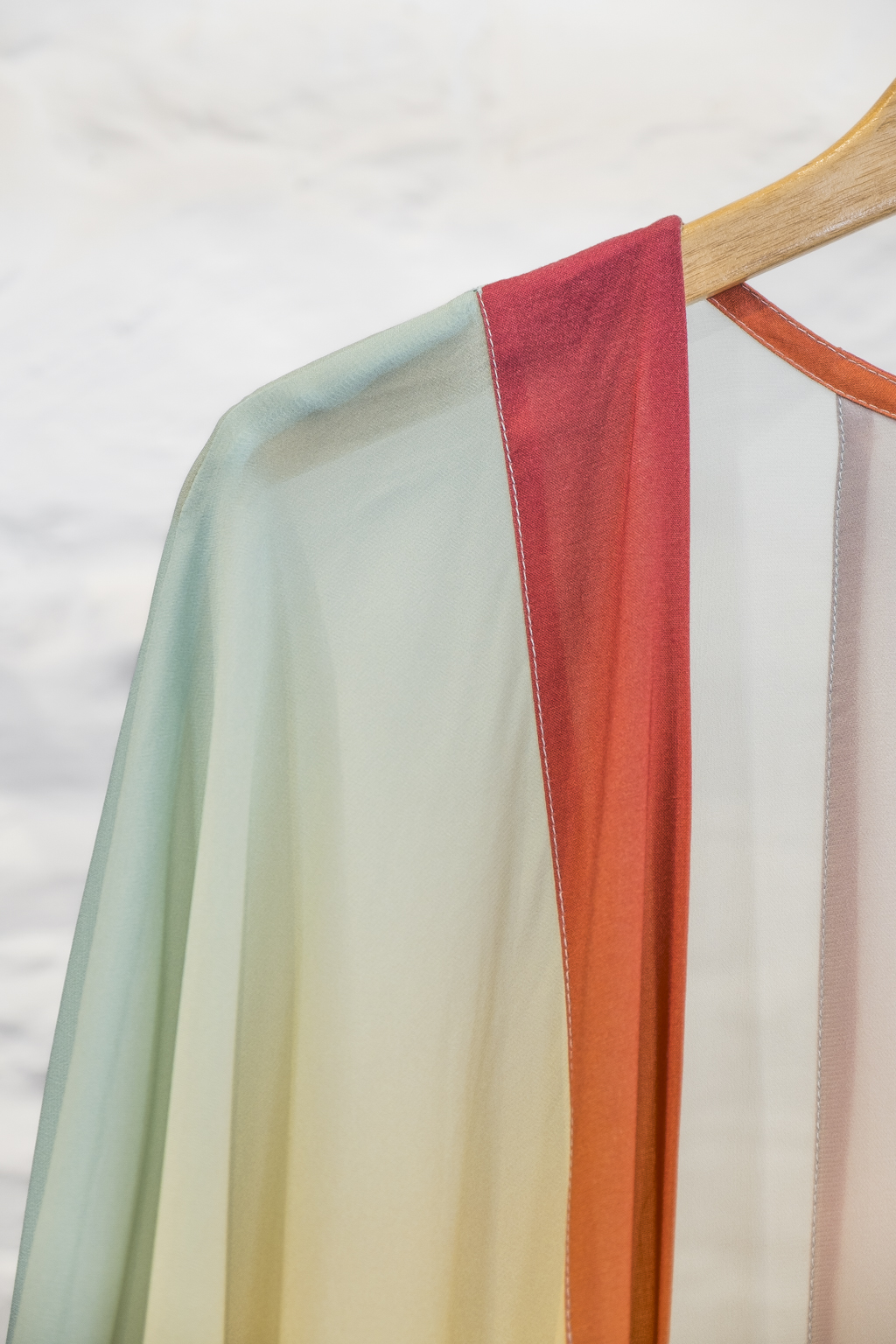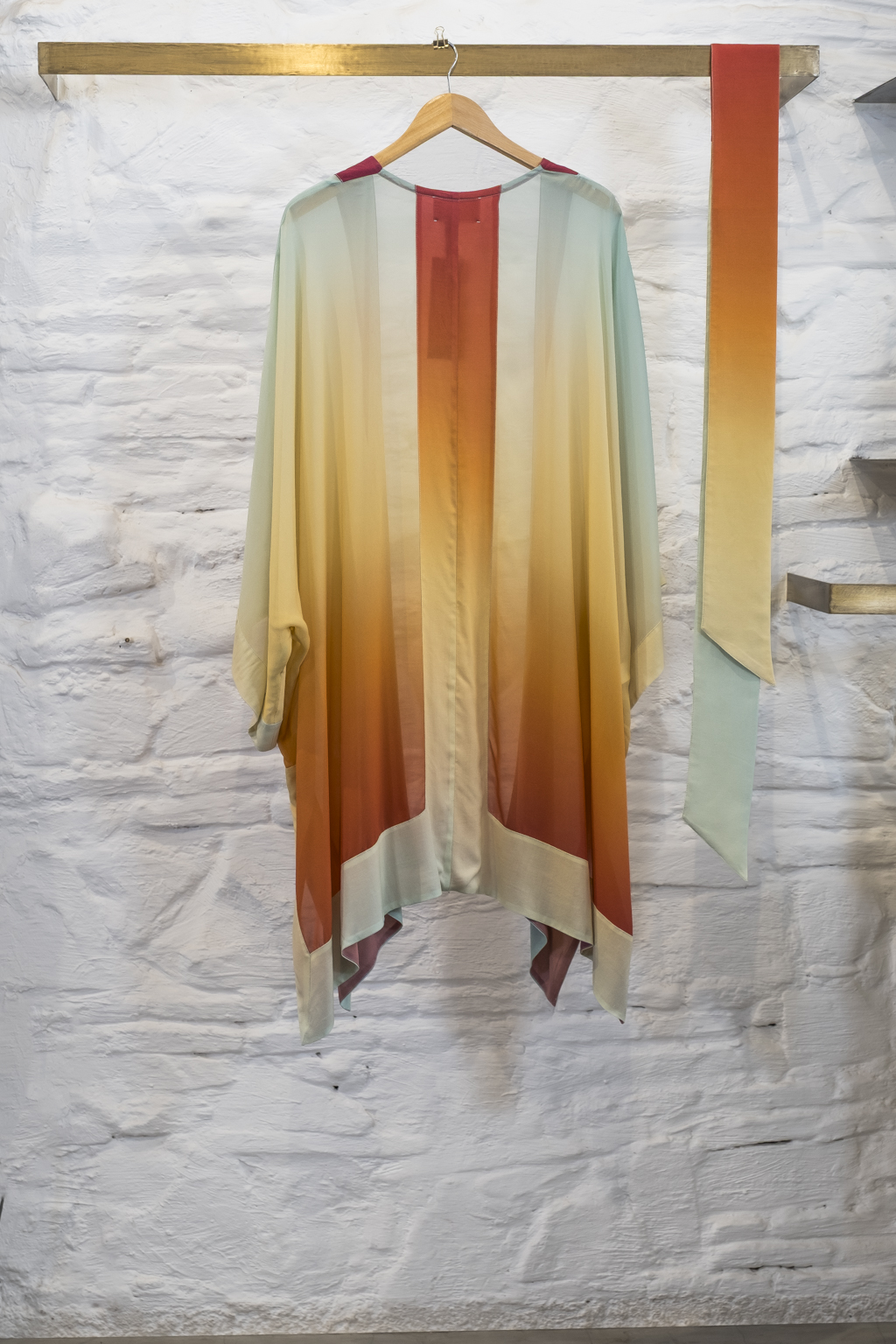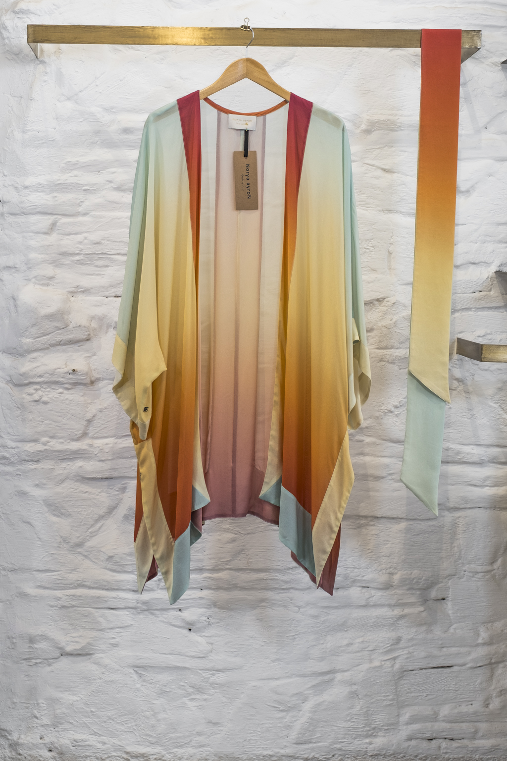 The short Kimono is like a light, fluid jacket. It provides an airy and simple style. It is versatile. You can wear it belted or open. It works for many occasions. During the day, wear it over a dress or shorts. In the evening, wear it over pants with heels. It is elegant and comfortable. It represents an effortless, chic, and practical style.