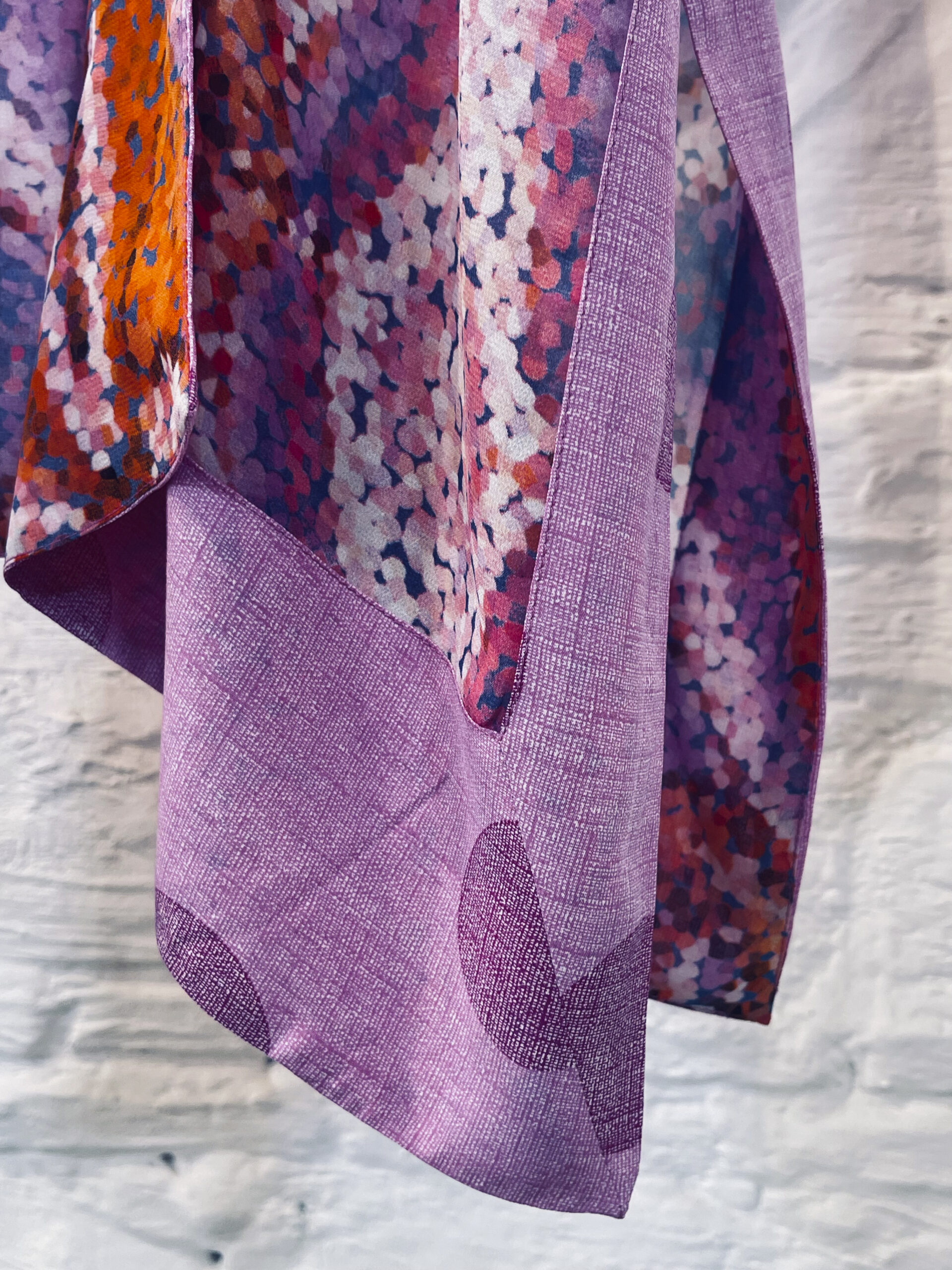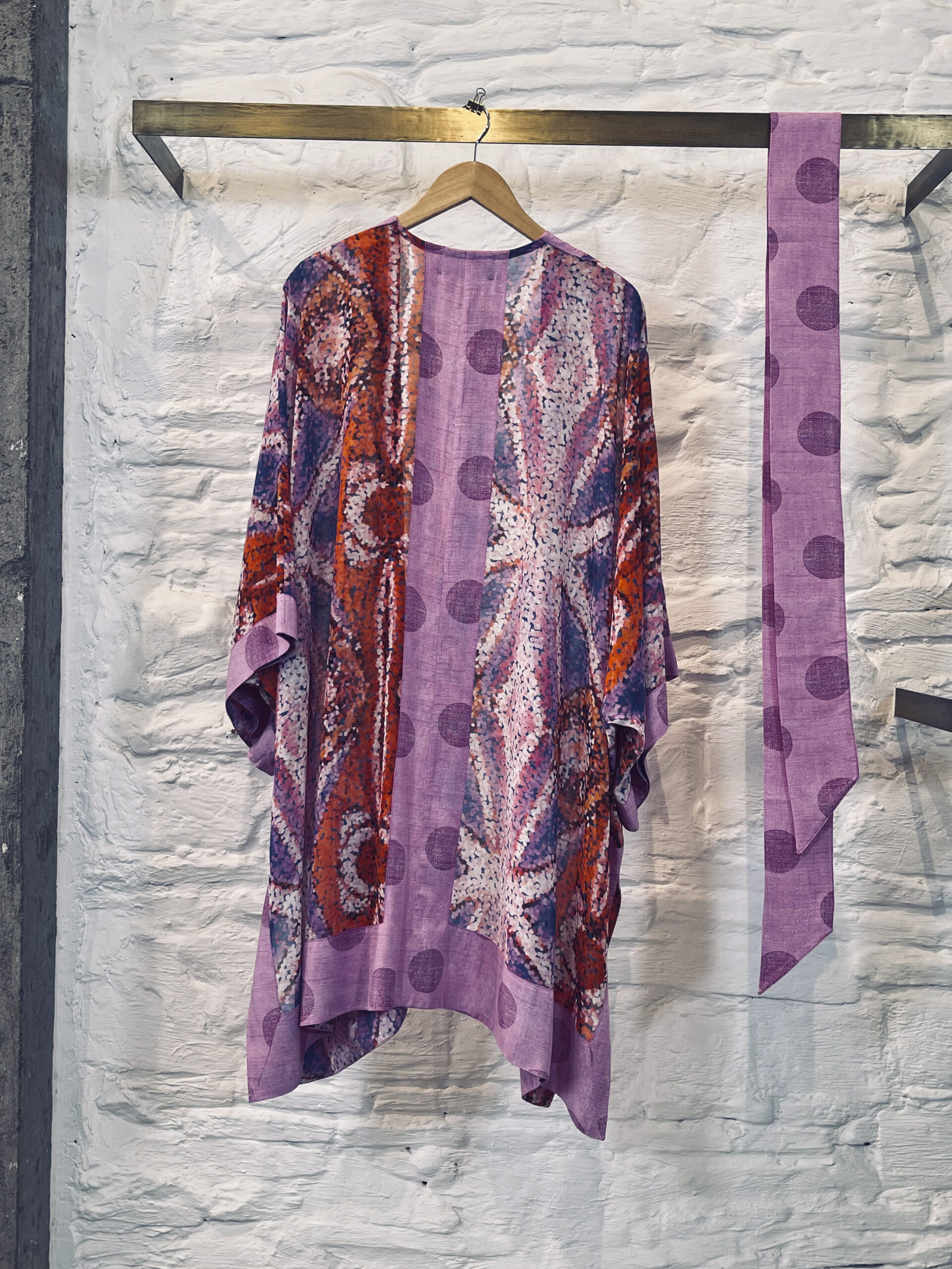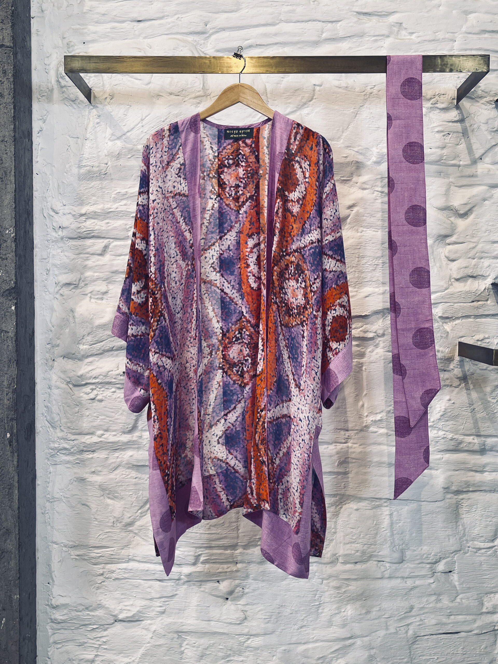 The short Kimono is like a light, fluid jacket. It provides an airy and simple style. It is versatile. You can wear it belted or open. It works for many occasions. During the day, wear it over a dress or shorts. In the evening, wear it over pants with heels. It is elegant and comfortable. It represents an effortless, chic, and practical style.