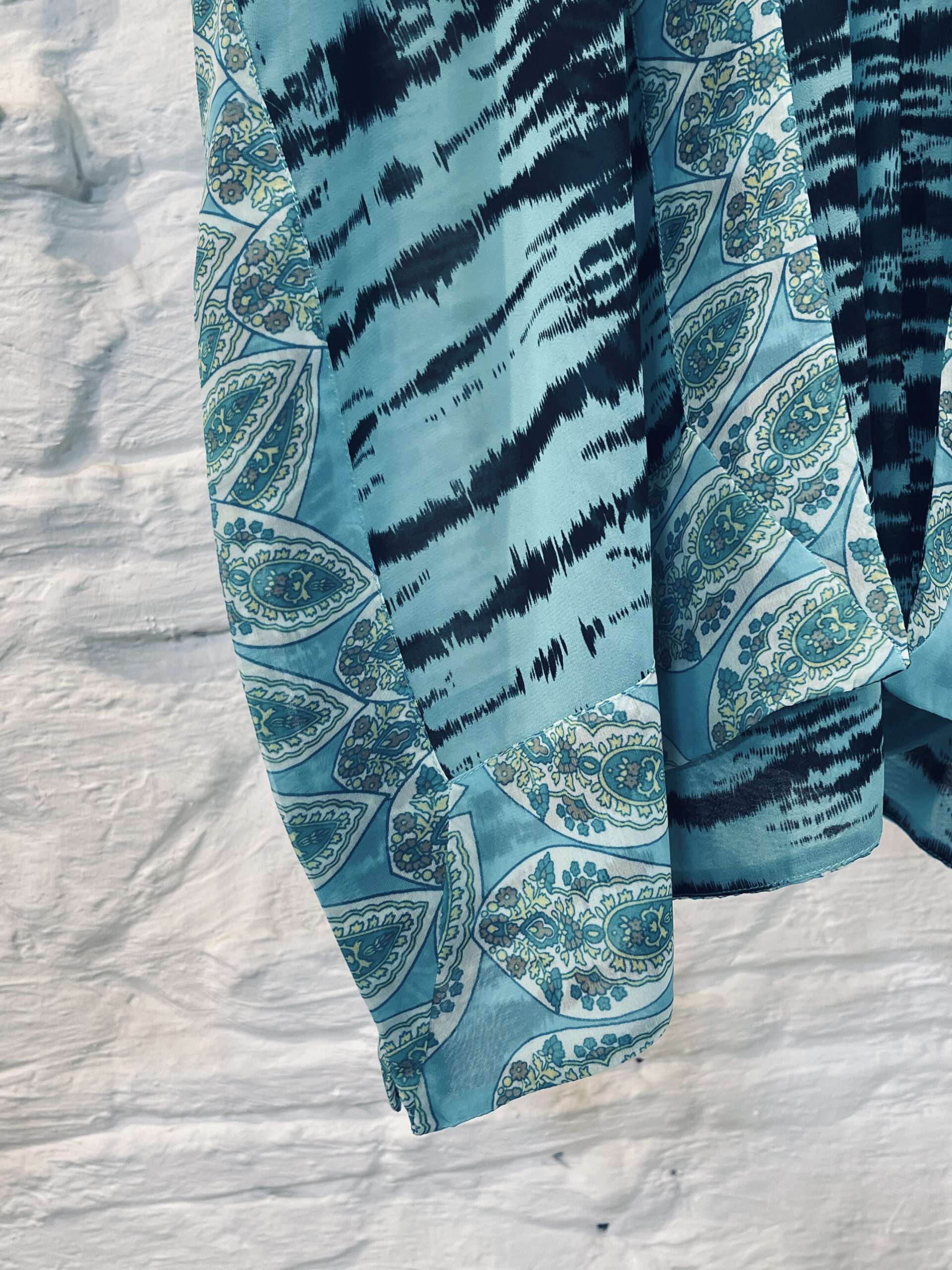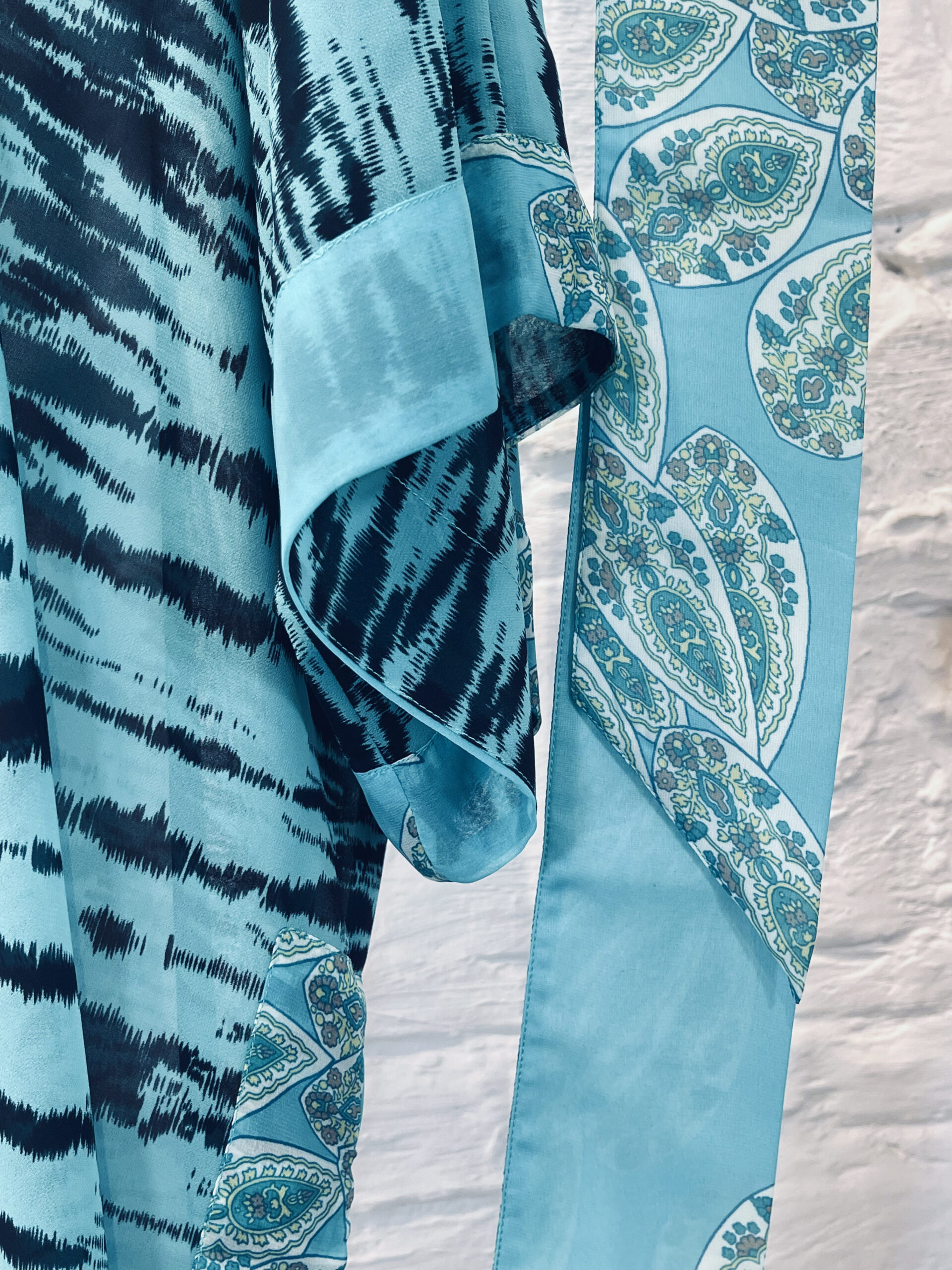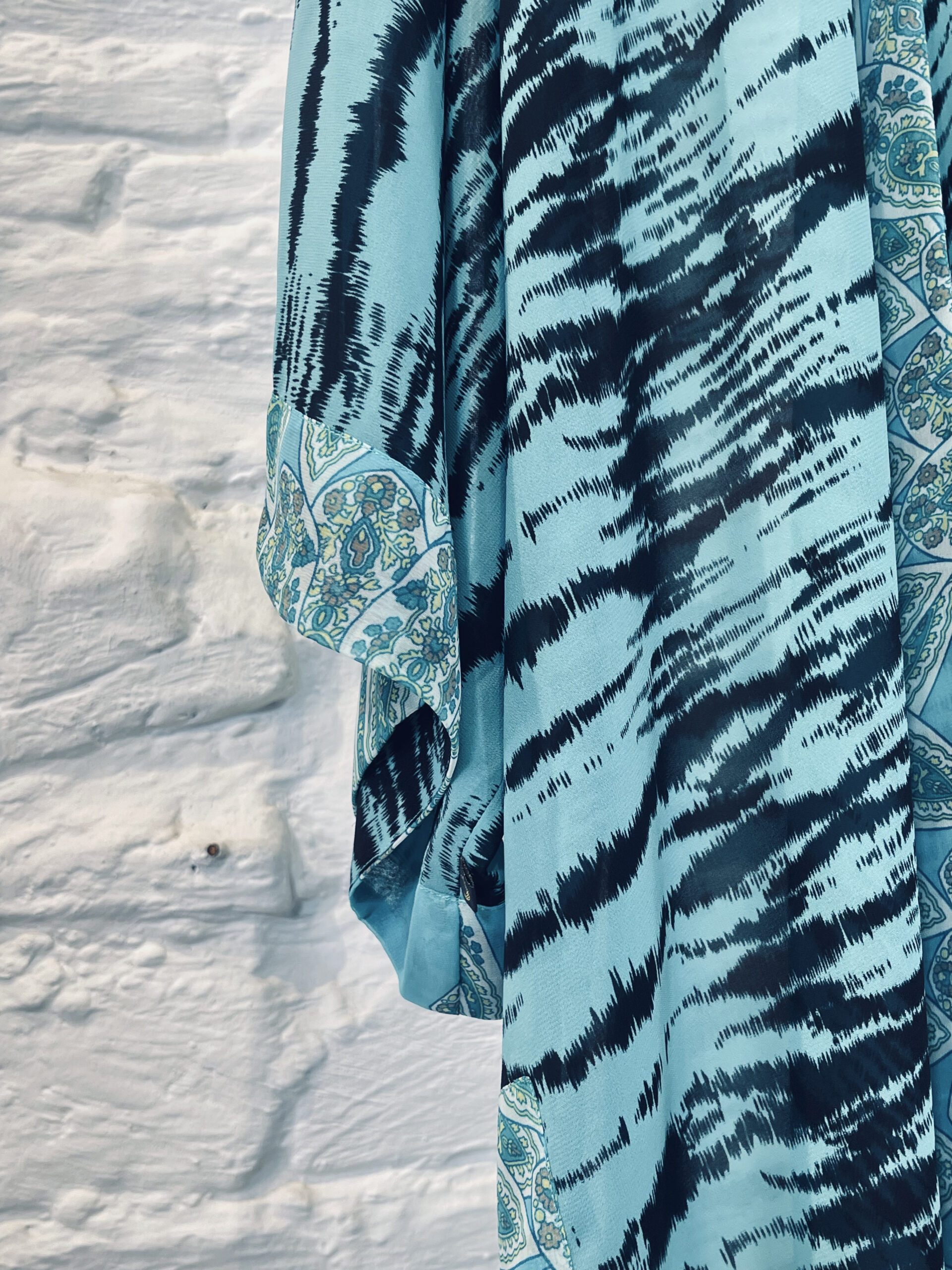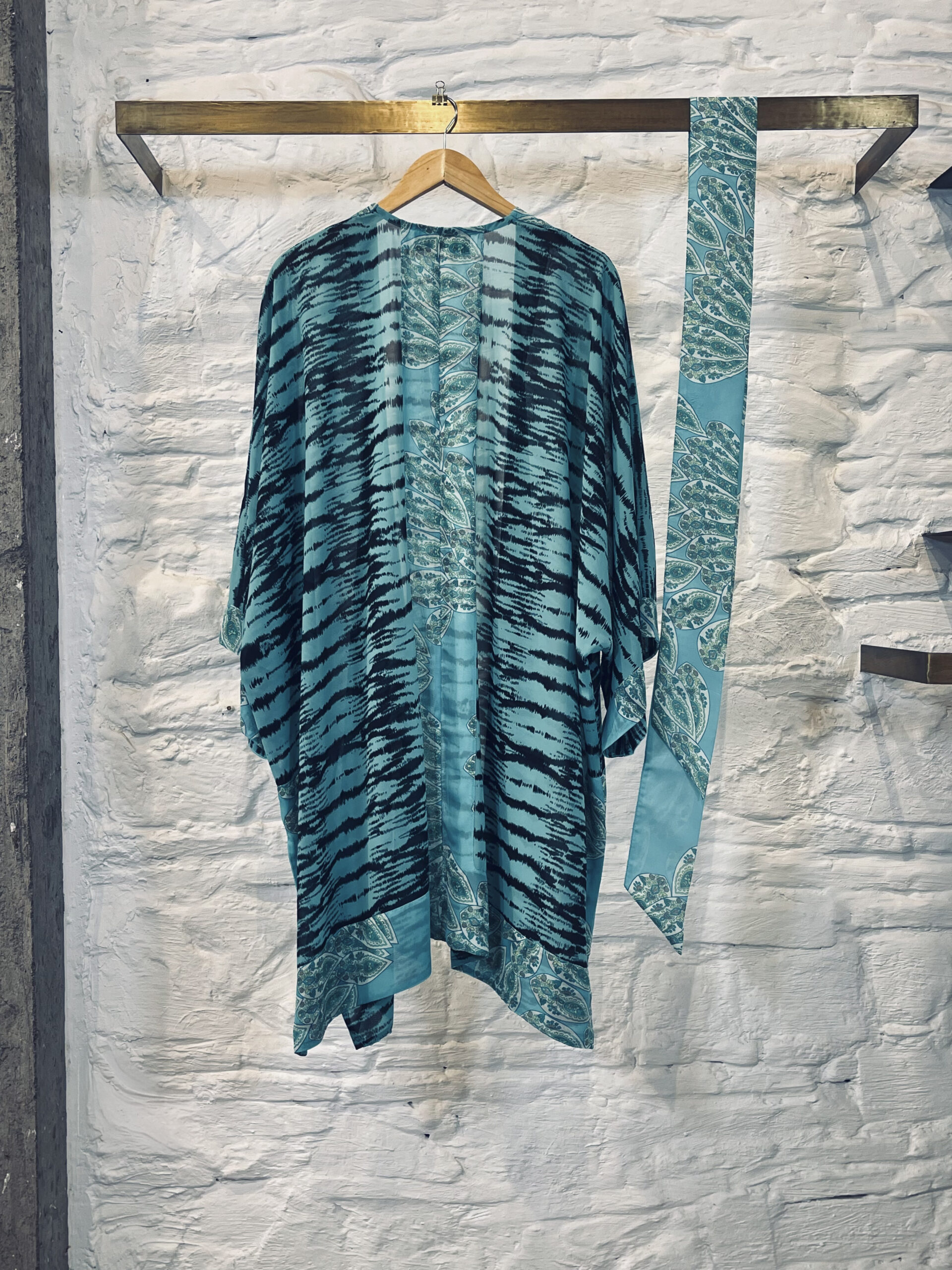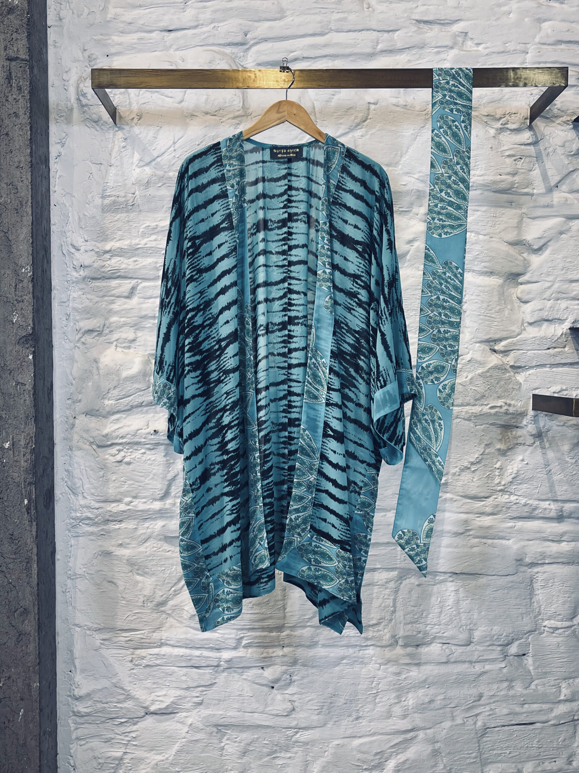 The short Kimono is like a light, fluid jacket. It provides an airy and simple style. It is versatile. You can wear it belted or open. It works for many occasions. During the day, wear it over a dress or shorts. In the evening, wear it over pants with heels. It is elegant and comfortable. It represents an effortless, chic, and practical style.
