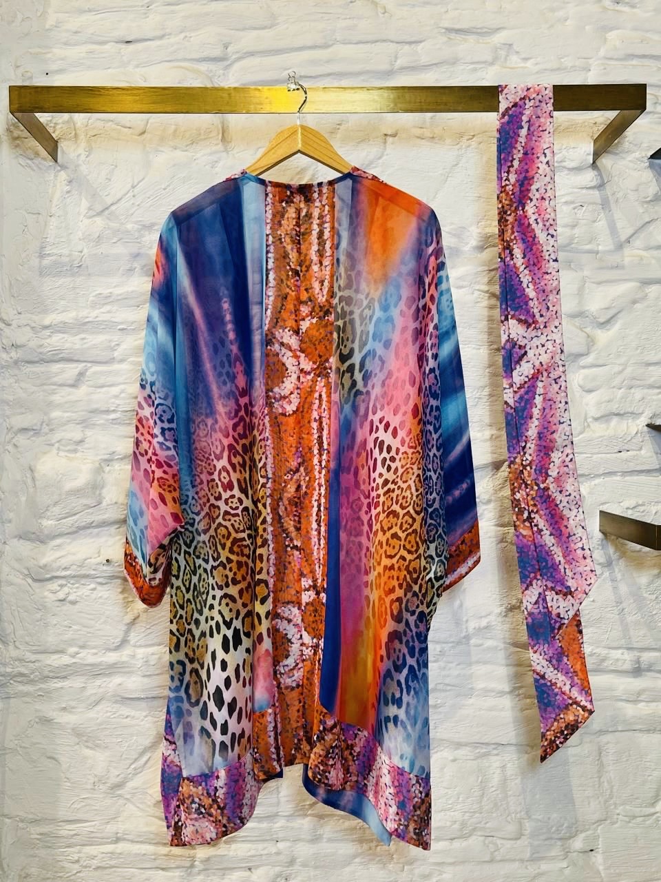 The short Kimono is like a light, fluid jacket. It provides an airy and simple style. It is versatile. You can wear it belted or open. It works for many occasions. During the day, wear it over a dress or shorts. In the evening, wear it over pants with heels. It is elegant and comfortable. It represents an effortless, chic, and practical style.