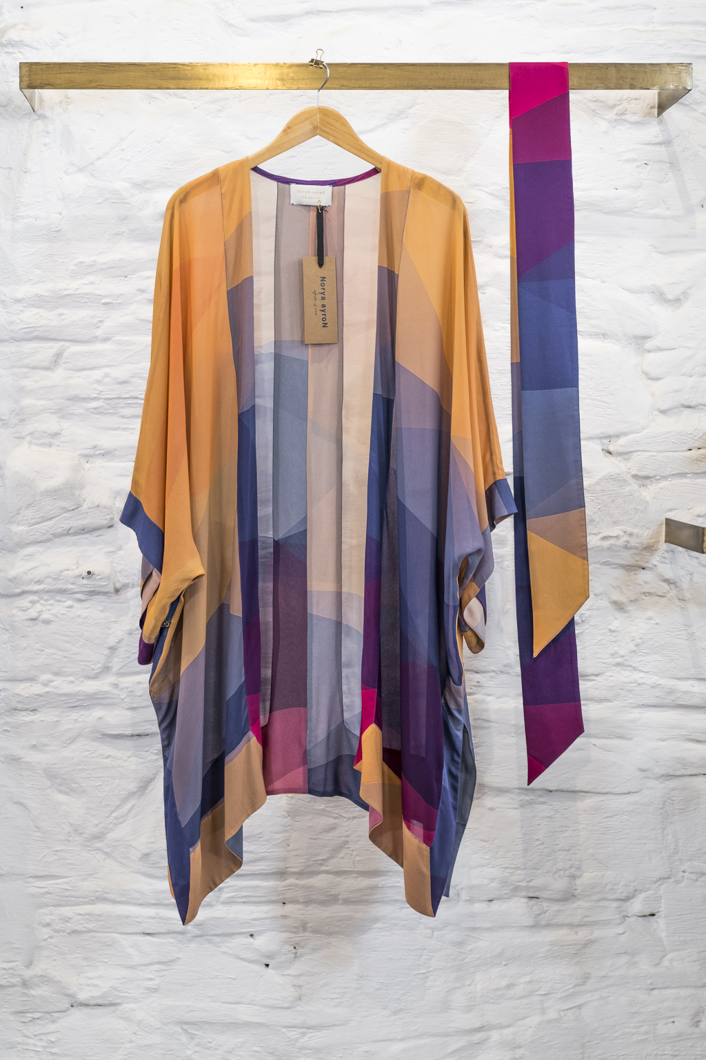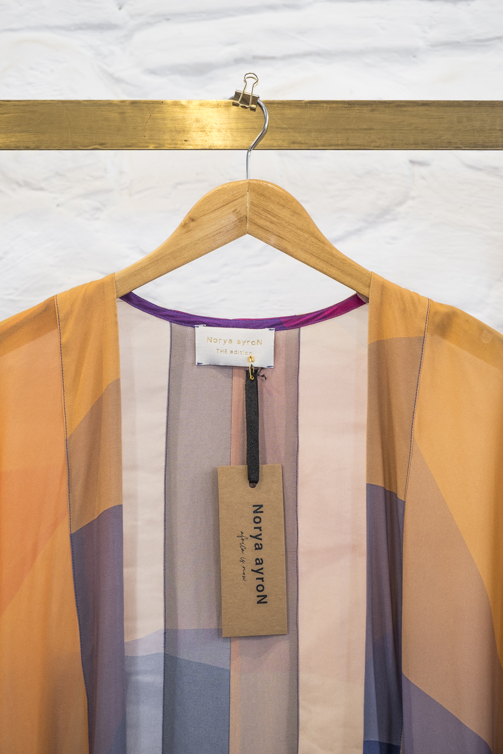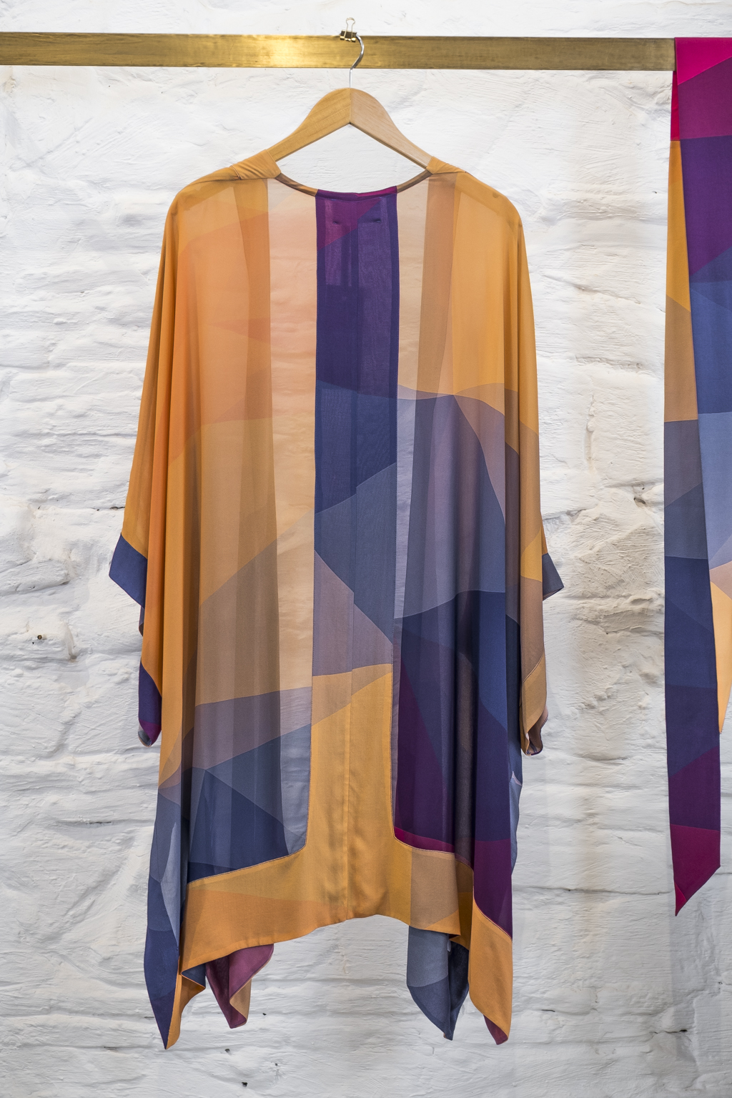 A simplified KIMONO shape, crafted from silk muslin. A wide band outlines its form like a painter’s stroke. This versatile piece can be worn as a flowing dress or an elegant open coat.